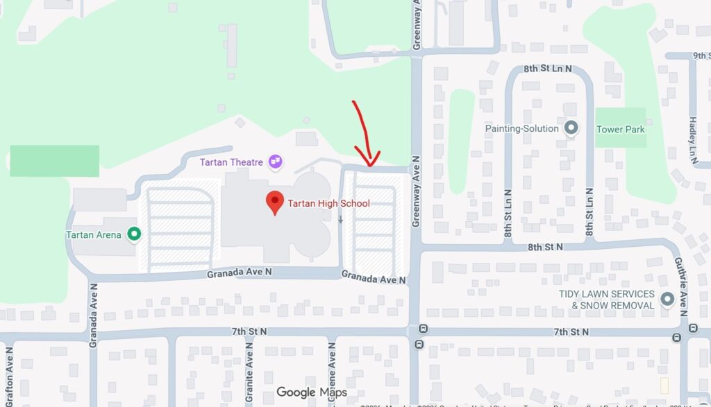 Folks should park in the front parking lot of Tartan High School for easiest access to the auditorium! See image from google maps below for reference: